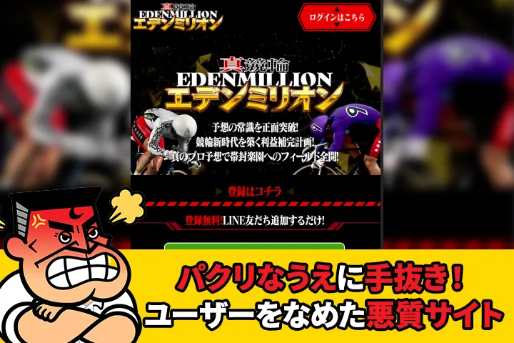 有名アニメをパクってる競輪予想サイト「真競輪エデンミリオン」!予想も当たらず、サイト内には誤情報も多い!